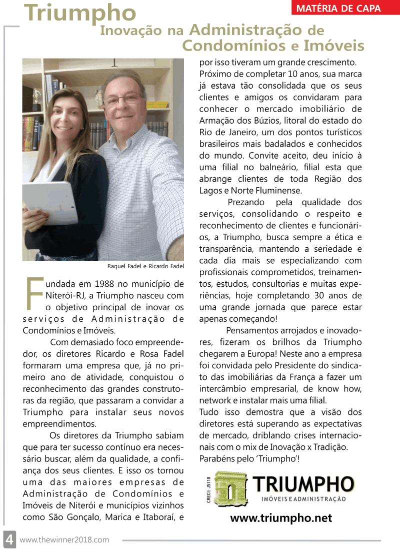 A Triumpho foi indicada e condecorada mundialmente pela revista International Business Magazine, em reconhecimento da qualidade nos seus serviços prestados, com a premiação THE WINNER 2018.
